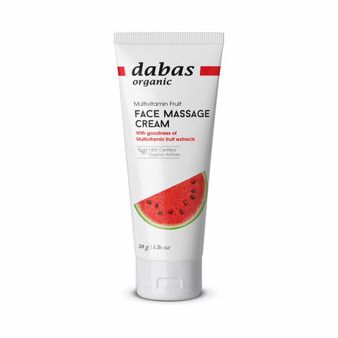 - Dabas organics face massage cream contains all natural ingredients like Watermelon extract, Raspberry Seed oil, Grape seed Oil, Orange peel extract and Aloevera extract which removes dead skin cells and gives a instant glow on your face.